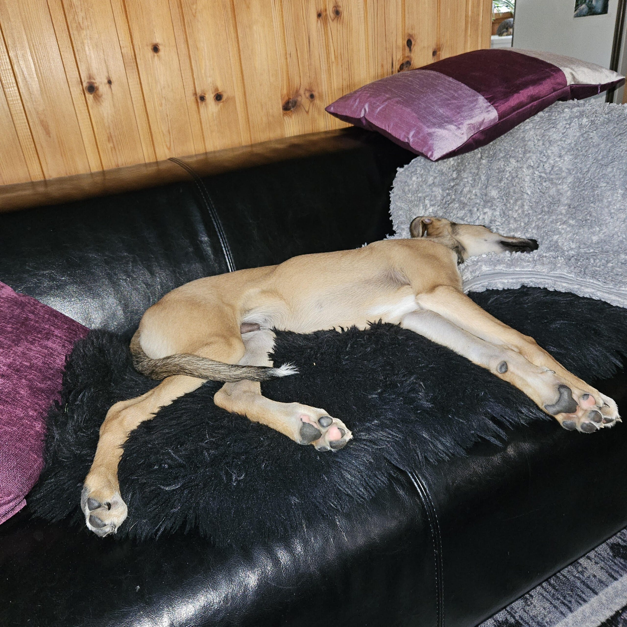 Lyckan är total hos oss alla — vilken fin valp vi fick. Han njuter och vi njuter. Vi har spenderat mycket tid i trädgården och fått besök av både barn och barnbarn. Han älskar alla. När det bara är jag och han i stugan kan han slappna av och sova ordentligt. Natten vi kom hem efter att jag hämtat honom från transporten sov han lugnt med mig i sängen tills jag gick upp.
