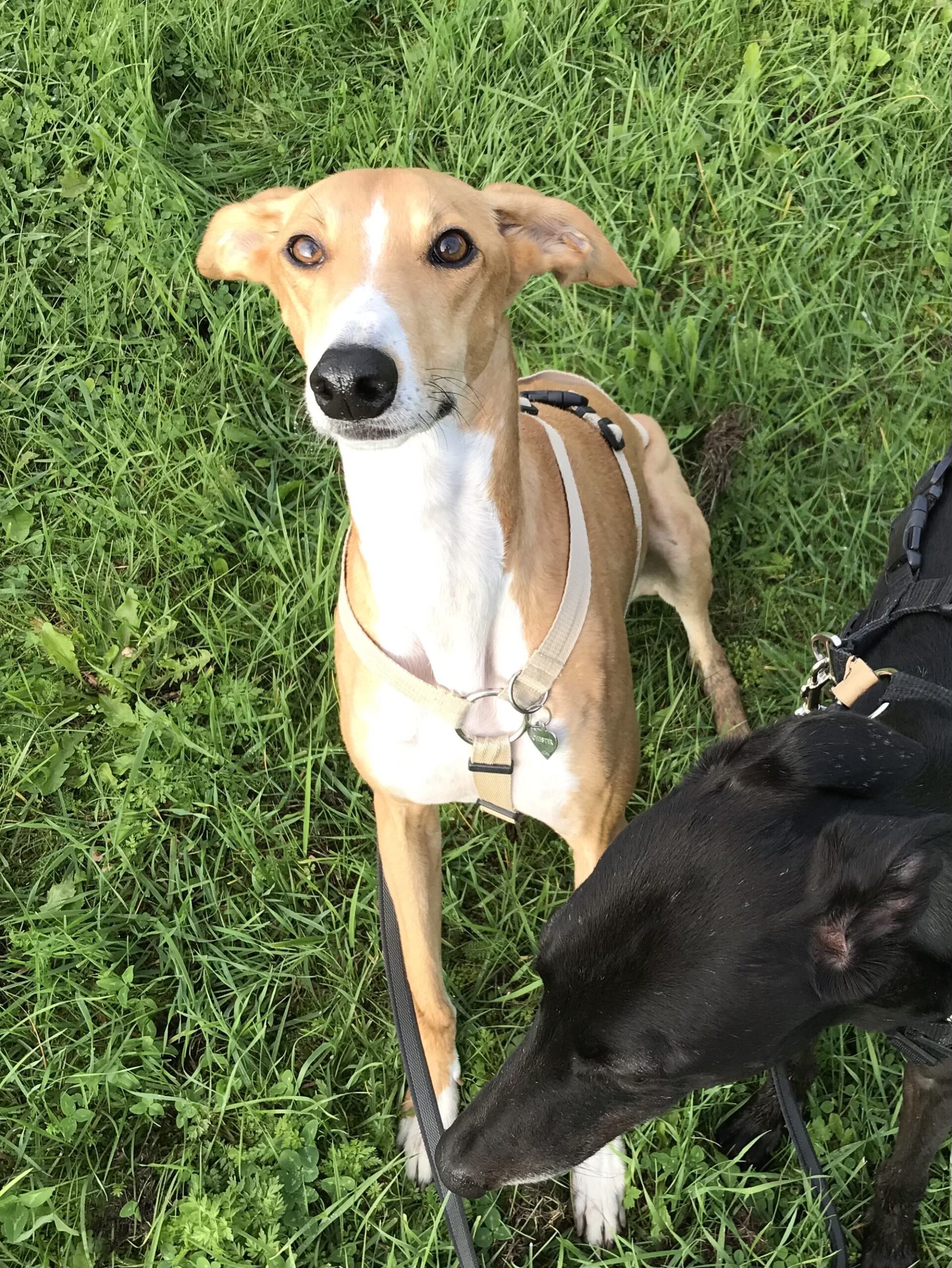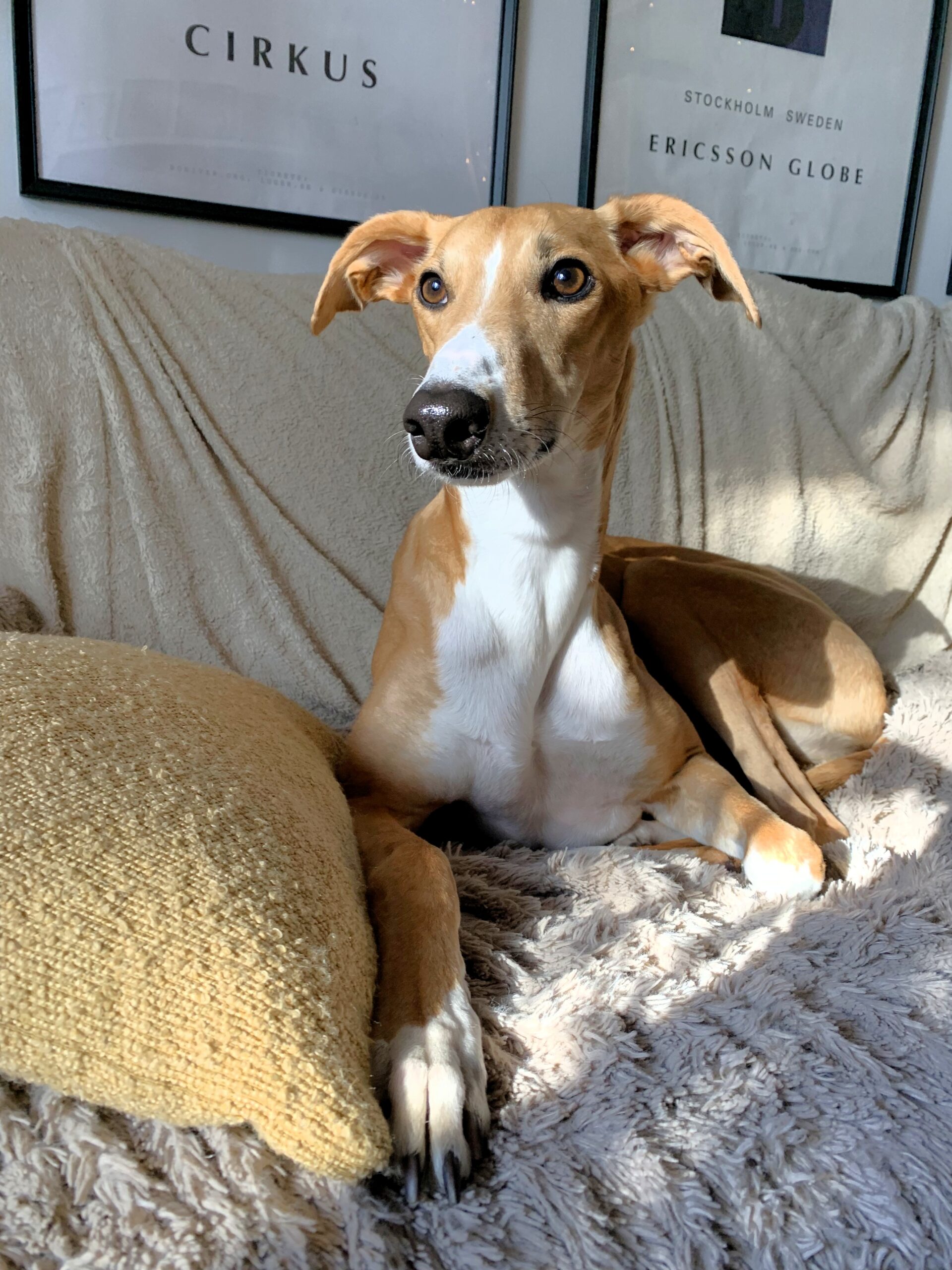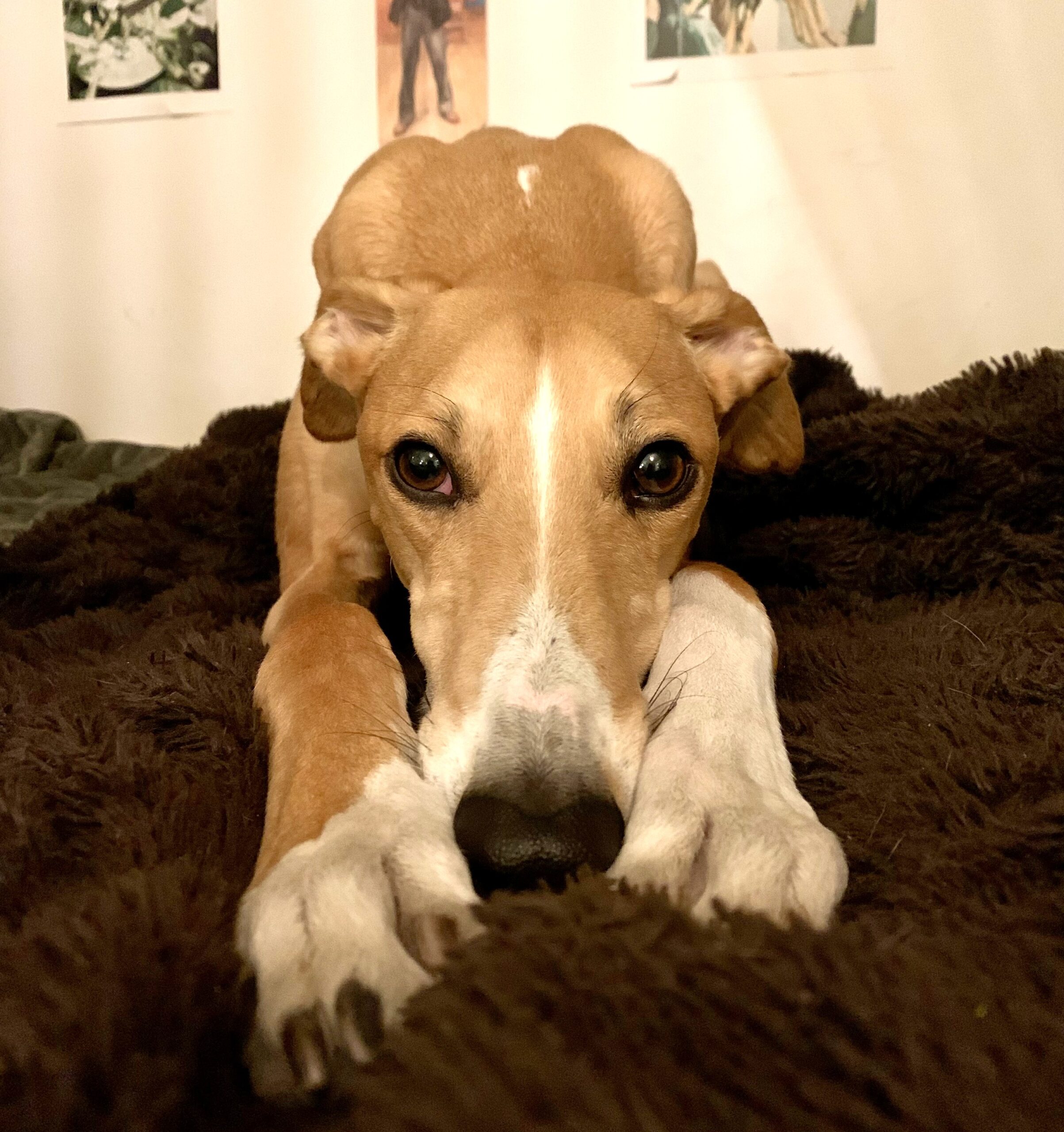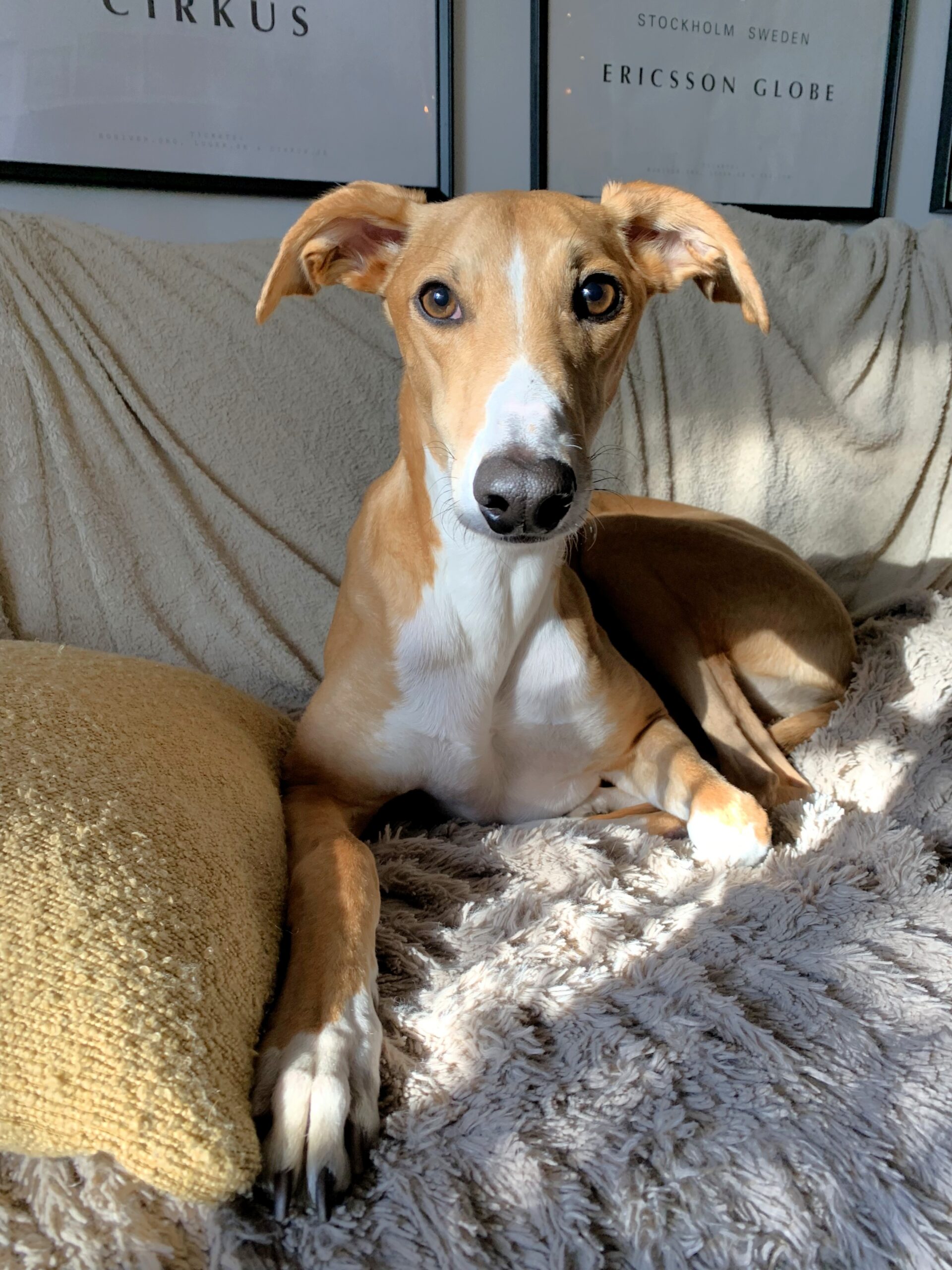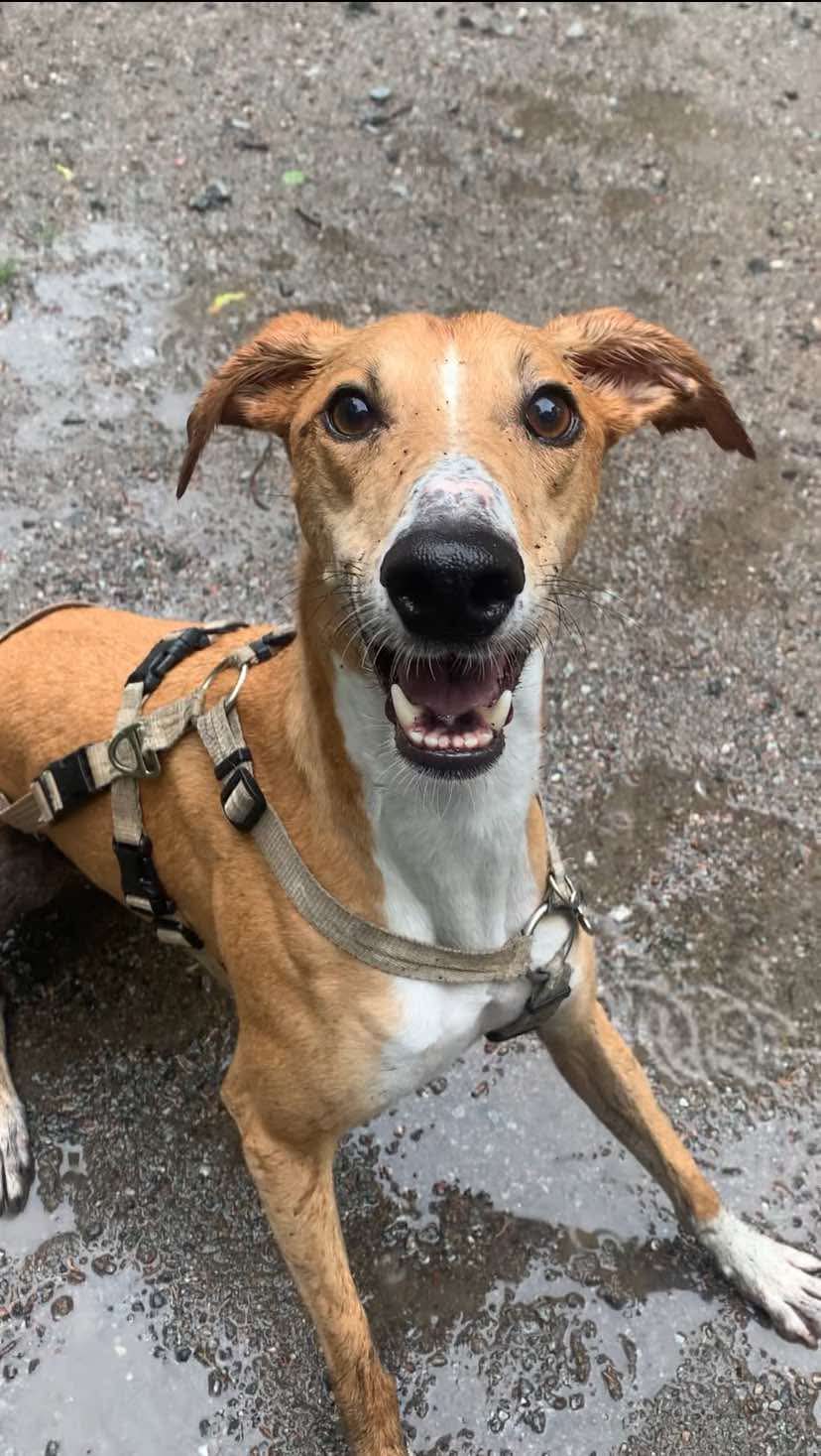 ”Chester är en riktig myspropp och det bästa han vet är att ligga tätt tillsammans i soffan. Jag har inte träffat en hund som njuter så mycket närhet och gos som Chester gör. Chester älskar människor och alla som träffar honom blir förälskade. Han är också försiktig och tålmodig med min livfulla systerson. Utöver mys och vila vill Chester busa och springa fort som vinden. Släpper man honom i ett inhägnat område roar han sig själv genom att springa fram och tillbaka och kasta och fånga sin leksak. Chester delar hem med en annan hund och har ett gäng hundkompisar som han tycker mycket om. Vid möten med okända hundar blir han osäker och behöver stöd och avstånd. Chester är lyhörd och rolig att träna med, han anpassar sig väl till nya miljöer och tycker om att följa med. Chester är duktig vid kloklippning och annan hantering om man behandlar honom mjukt och respektfullt. Chester är världens mysigaste och härligaste kille som blir glad över alla livets små saker på ett sätt som smittar av sig. Chester omplaceras på grund av att min andra hund behöver bo som ensamhund.”