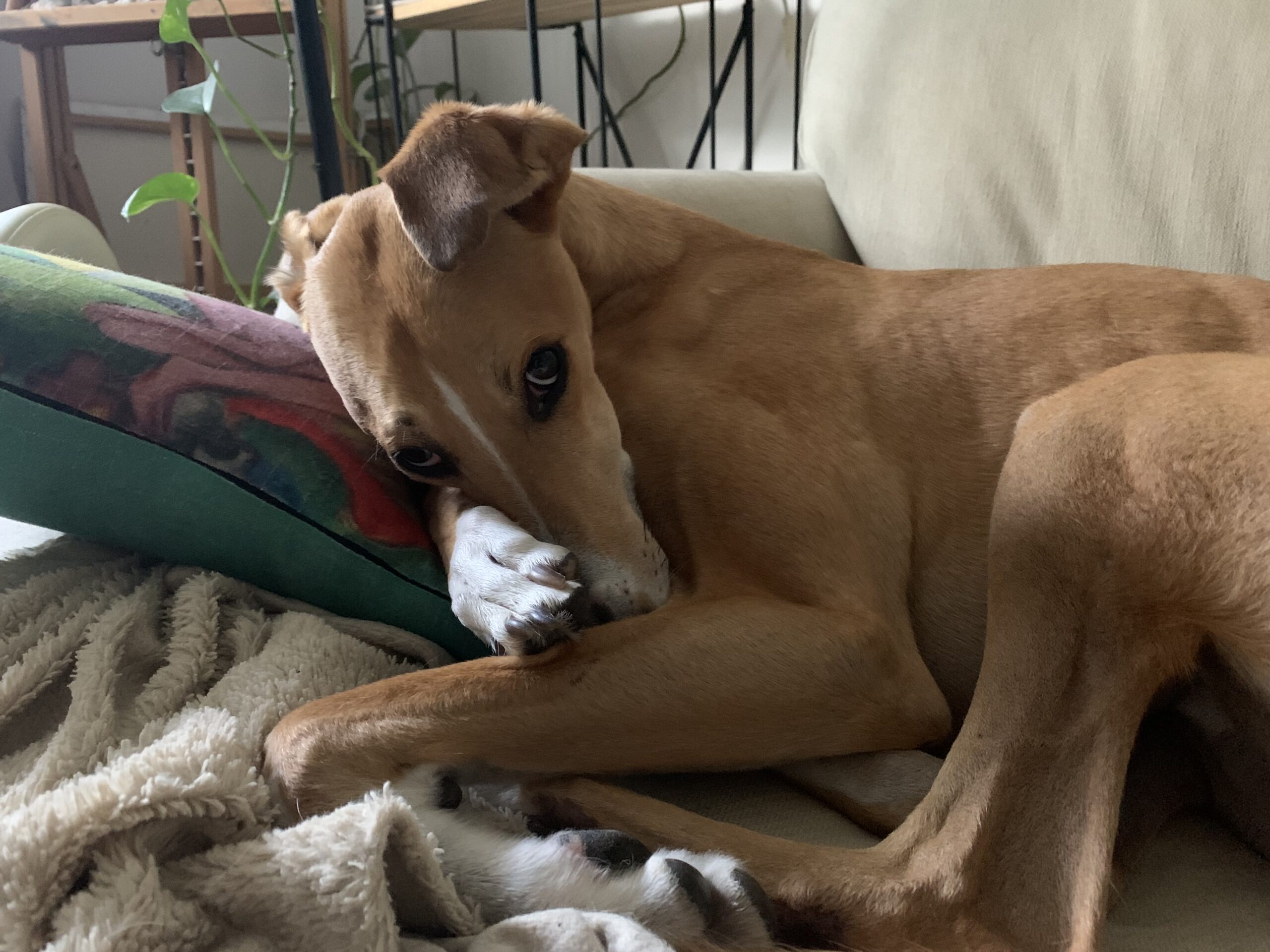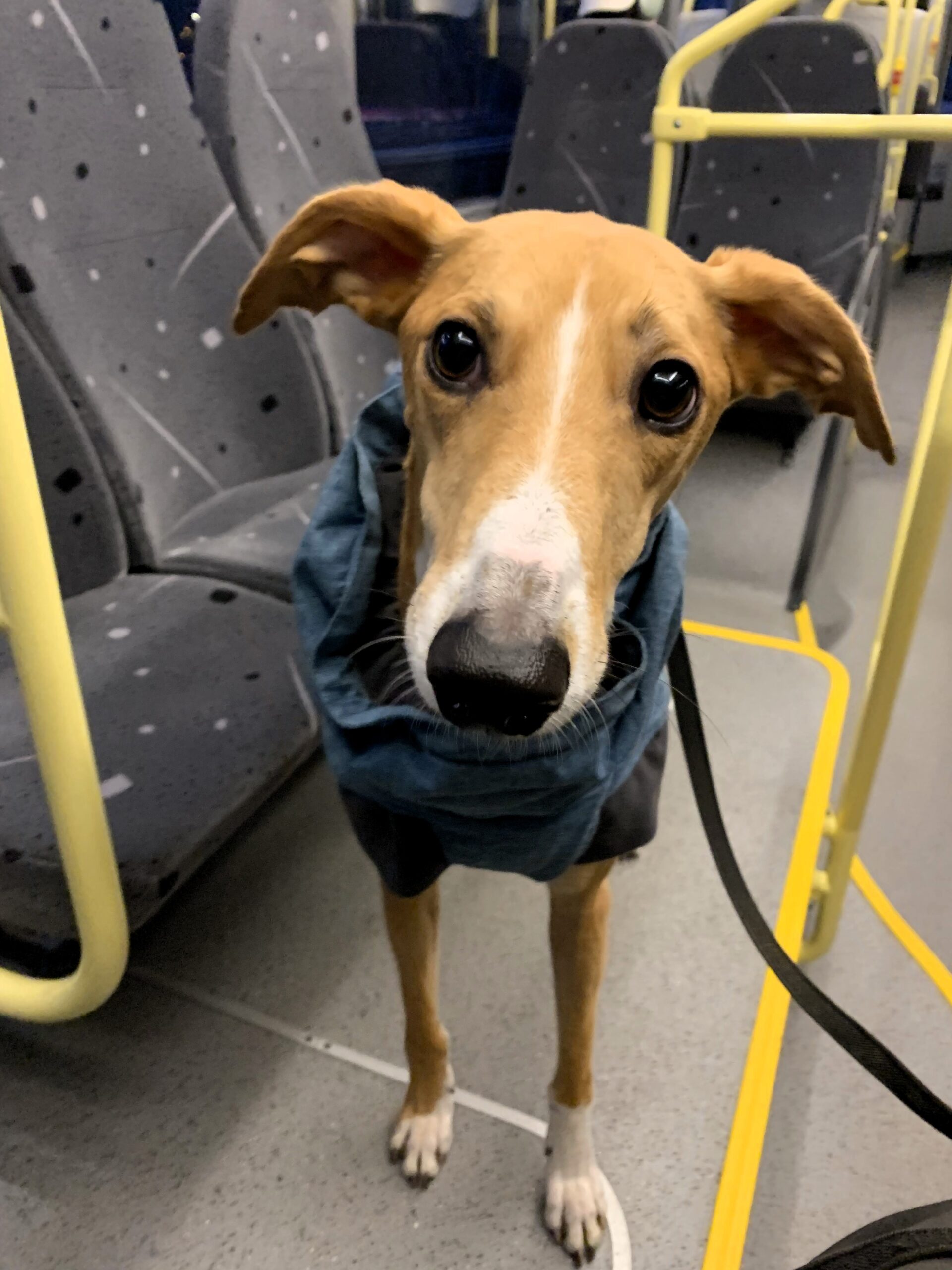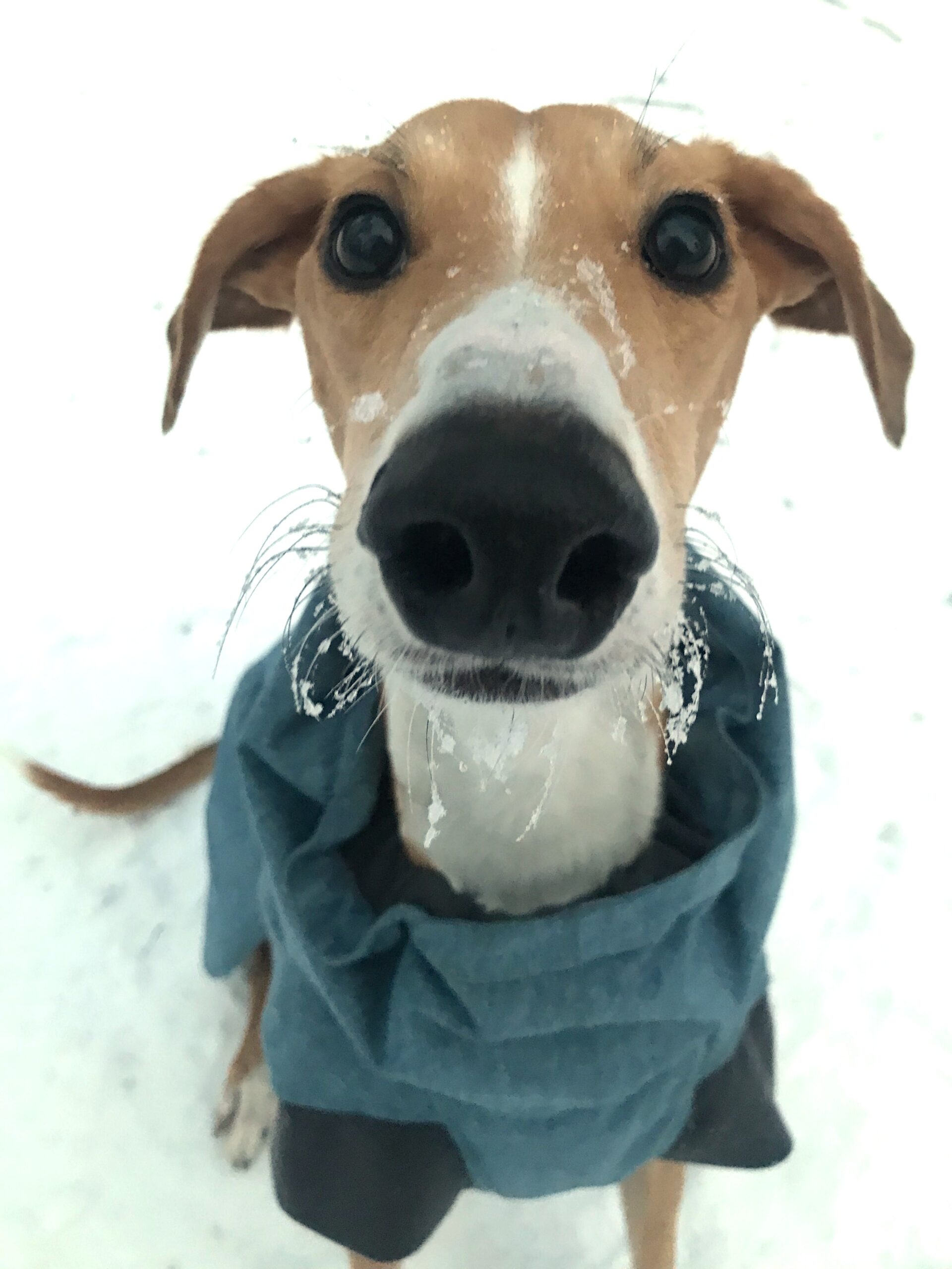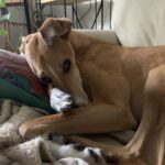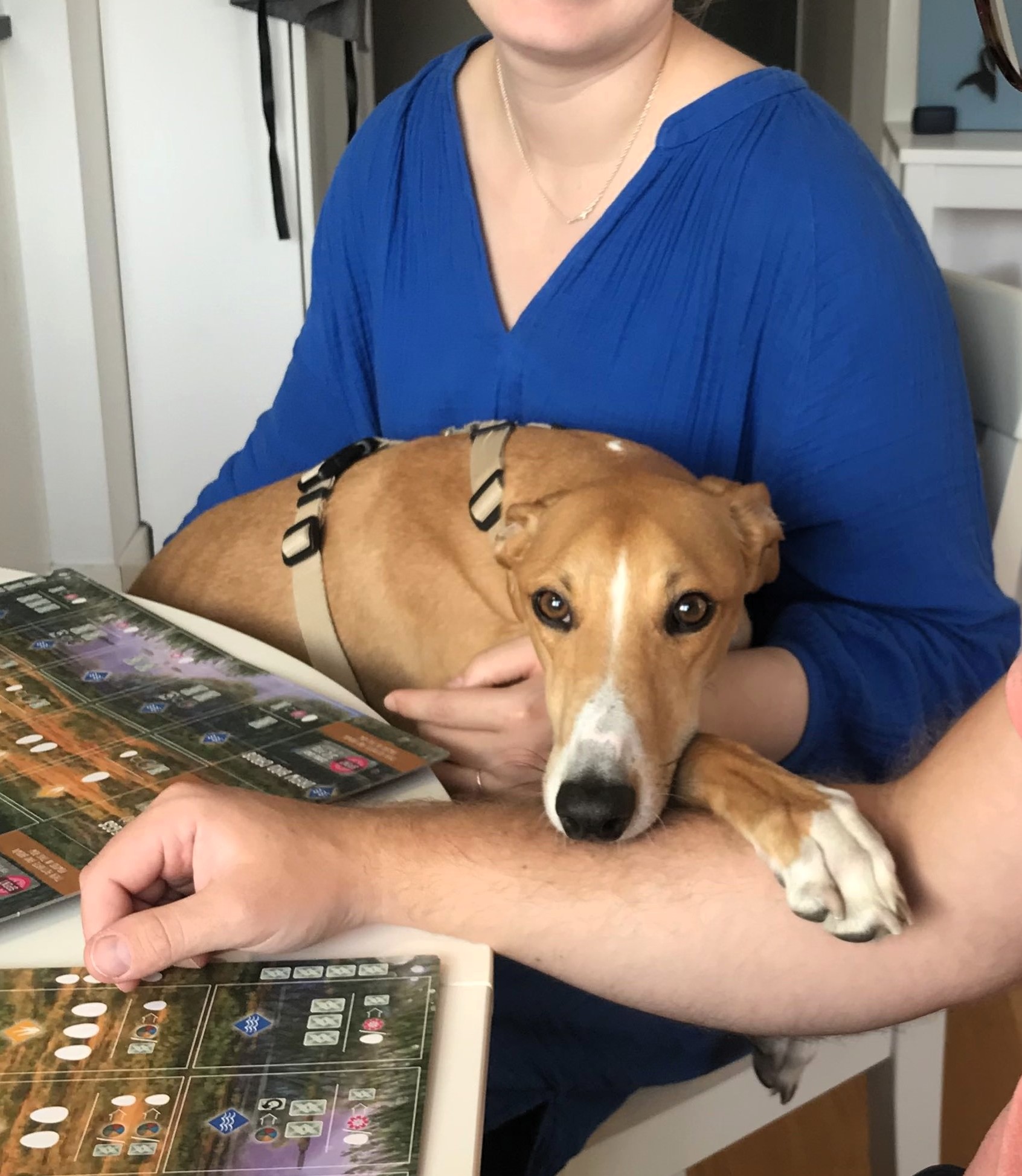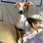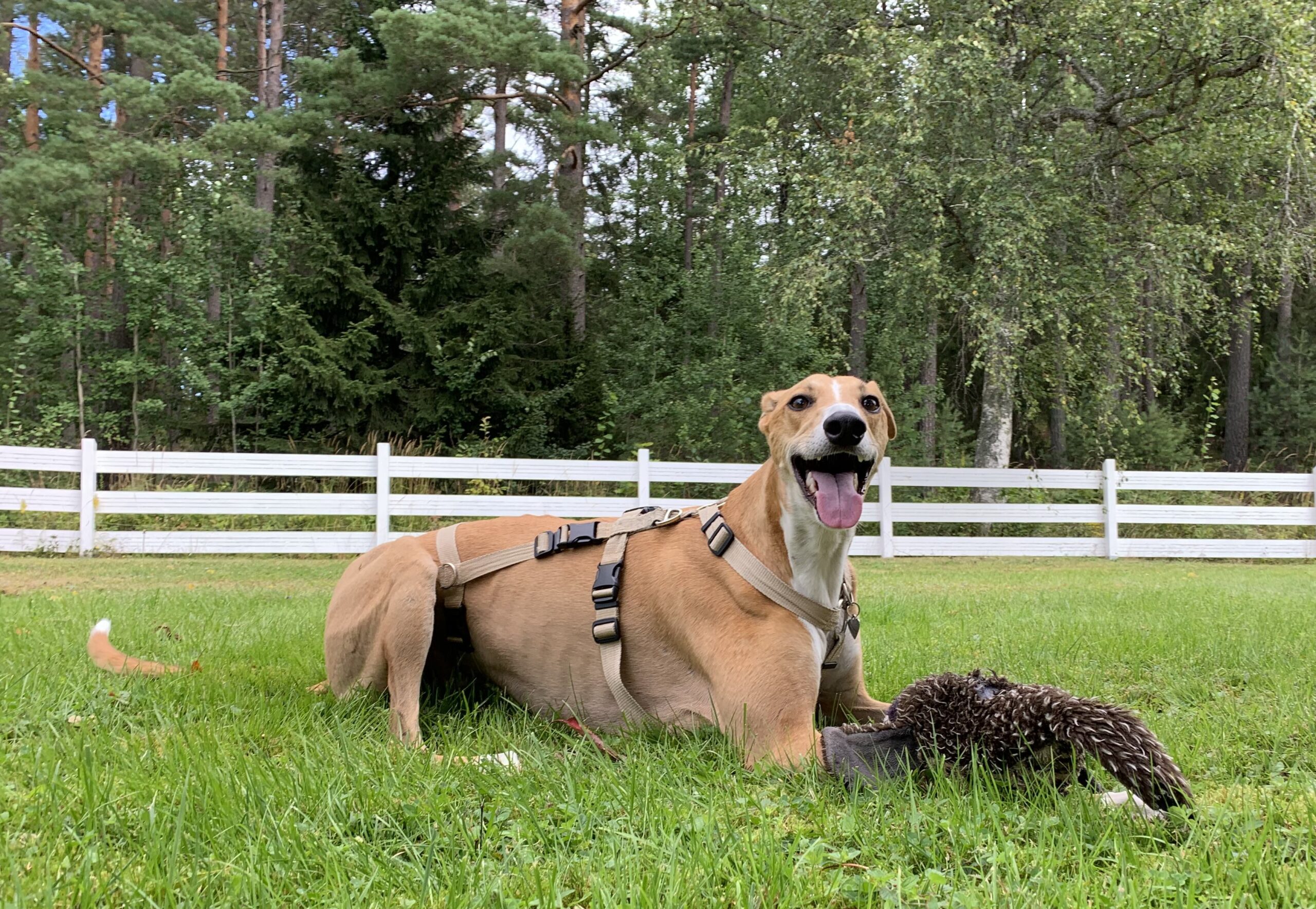 ”Chester är en riktig myspropp och det bästa han vet är att ligga tätt tillsammans i soffan. Jag har inte träffat en hund som njuter så mycket närhet och gos som Chester gör. Chester älskar människor och alla som träffar honom blir förälskade. Han är också försiktig och tålmodig med min livfulla systerson. Utöver mys och vila vill Chester busa och springa fort som vinden. Släpper man honom i ett inhägnat område roar han sig själv genom att springa fram och tillbaka och kasta och fånga sin leksak. Chester delar hem med en annan hund och har ett gäng hundkompisar som han tycker mycket om. Vid möten med okända hundar blir han osäker och behöver stöd och avstånd. Chester är lyhörd och rolig att träna med, han anpassar sig väl till nya miljöer och tycker om att följa med. Chester är duktig vid kloklippning och annan hantering om man behandlar honom mjukt och respektfullt. Chester är världens mysigaste och härligaste kille som blir glad över alla livets små saker på ett sätt som smittar av sig. Chester omplaceras på grund av att min andra hund behöver bo som ensamhund.”
