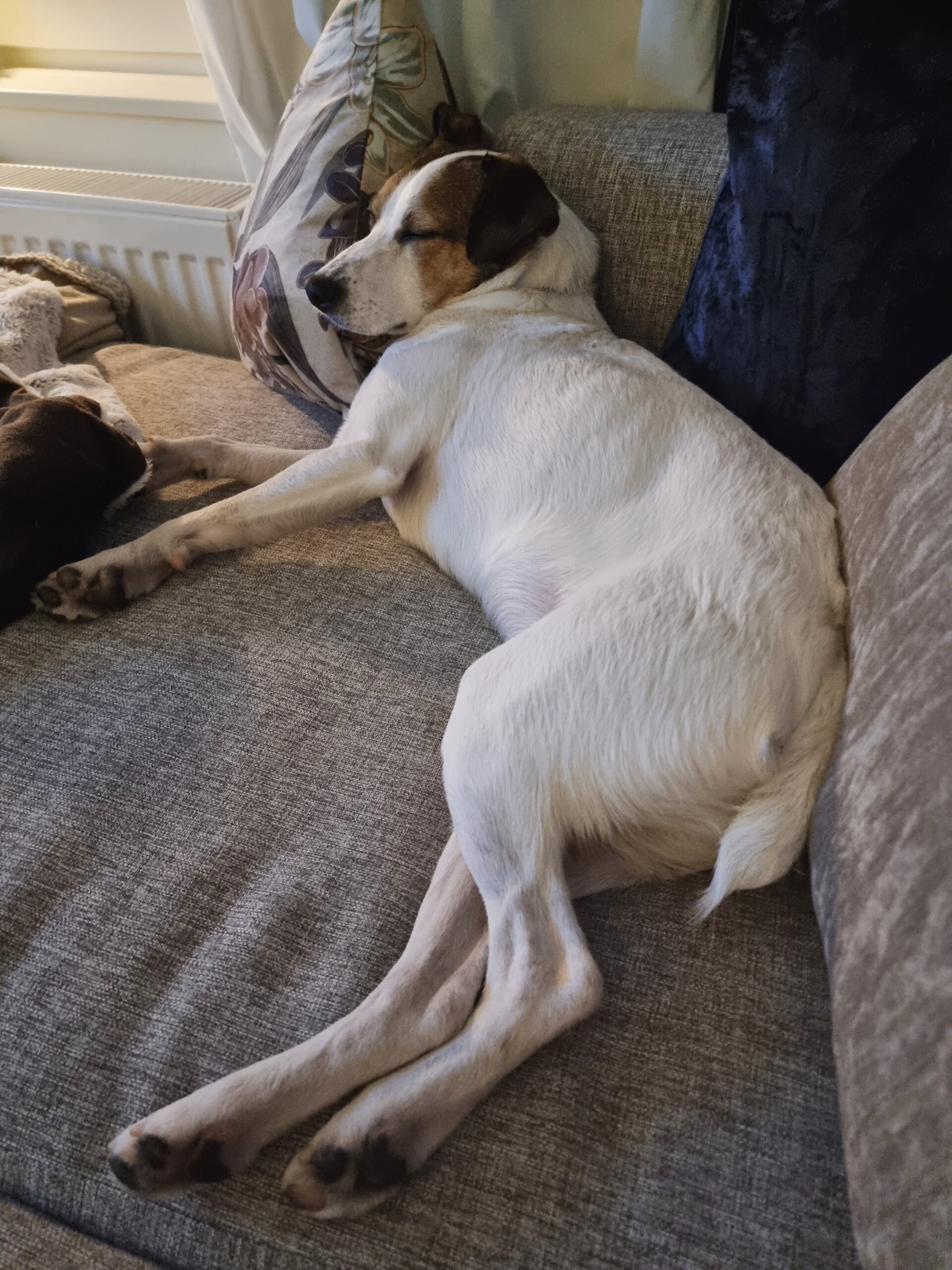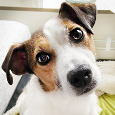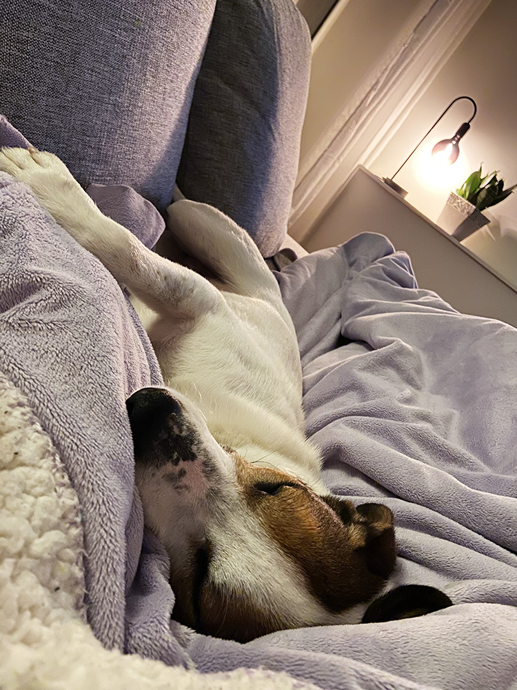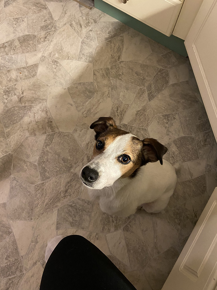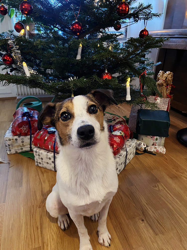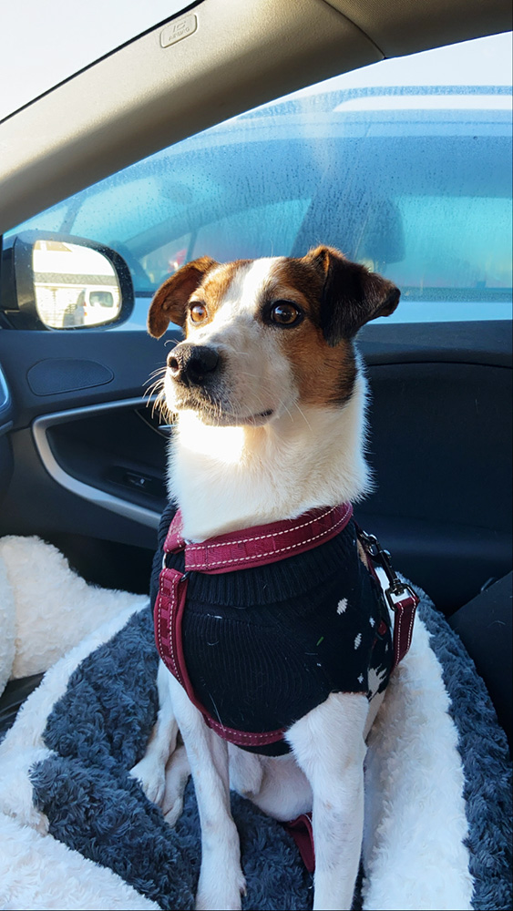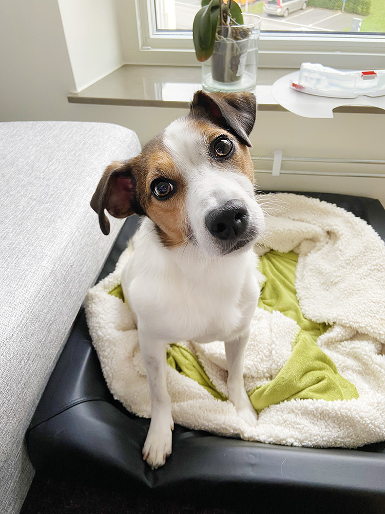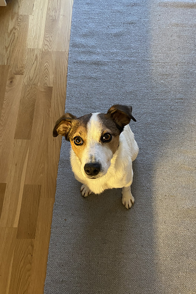 ”Så himla mysig och ska vara med överallt. Älskar att sitta bredvid och jobba. När jag har videomöte vill han sitta i knät. Han voffar till om något låter konstigt utifrån, men mest är han tyst och vill vara nära. Han är smart och lyssnar bra när vi går förbi andra människor, barnvagnar, resväskor m.m.”