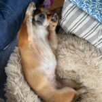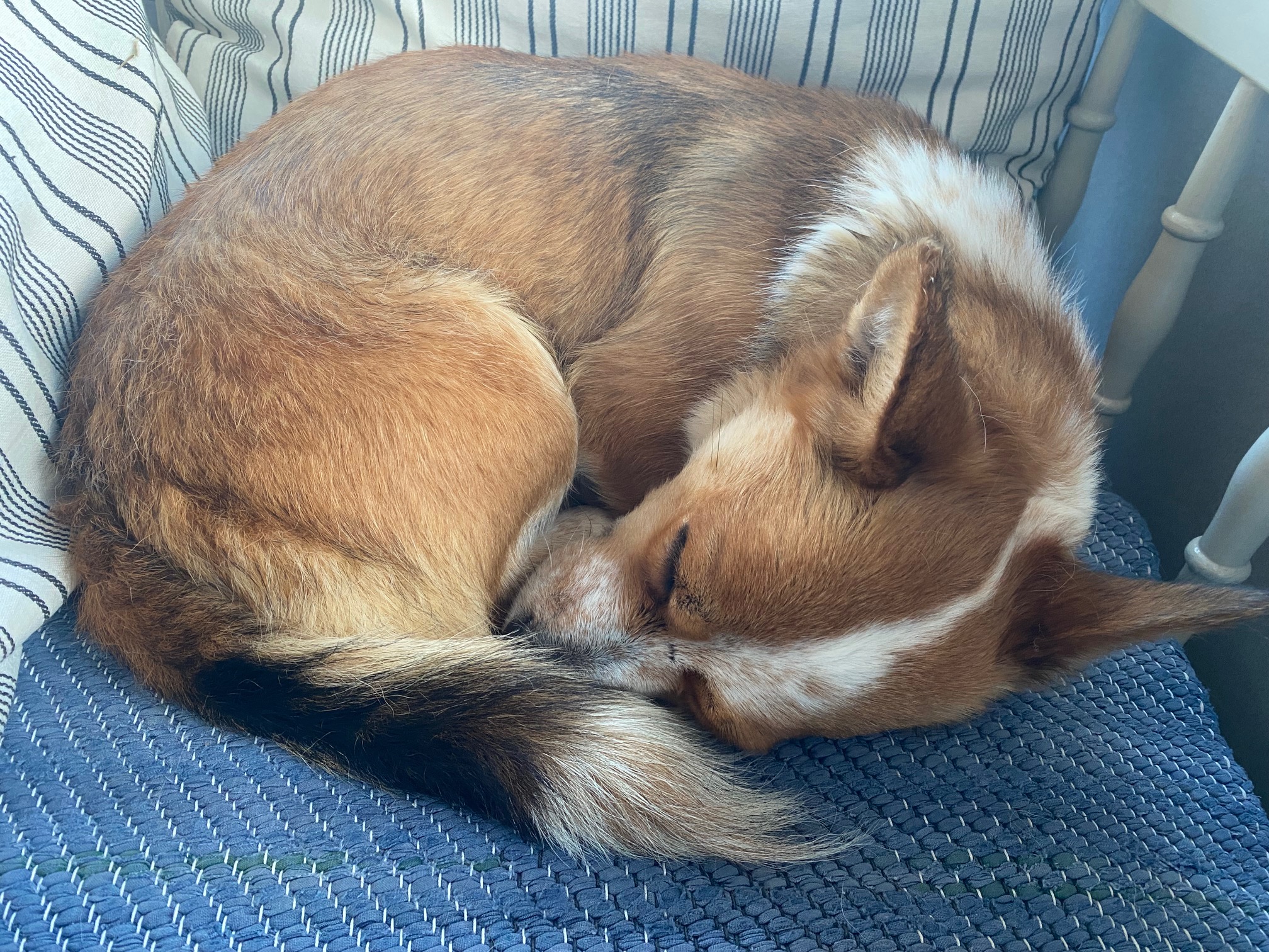 ”Corgi är en mycket snabb, graciös och spänstig tjej som trots sin ringa storlek tar sig upp på höjder man inte trodde var möjligt. Hon älskar mat och har en fallenhet för självservering. Corgi söker mycket närhet, att få krypa ihop som en cirkel i ens knä gör henne lugn och trygg. Hon är fortfarande försiktig och trivs bäst med lugna energier och stillsamma miljöer. Hon tydde sig snabbt till oss, men okända människor, framförallt män, är läskiga. Corgi fäller en del men myser vid borstning. Hon fungerar fint tillsammans med våra hundar och katt. I Corgi verkar det bo lika delar alert och rolig tramsbyxa som livsnjutande gosegris.”