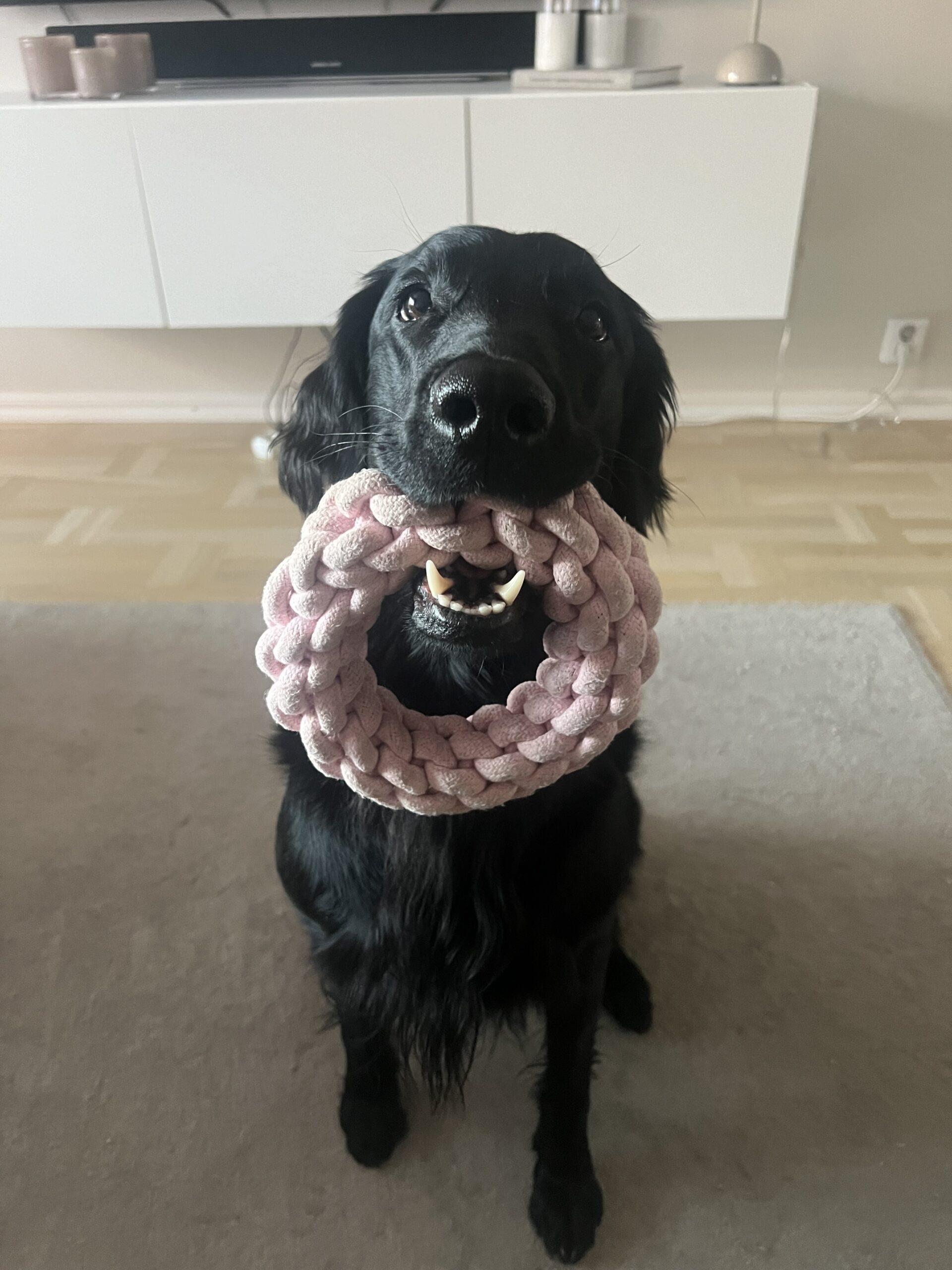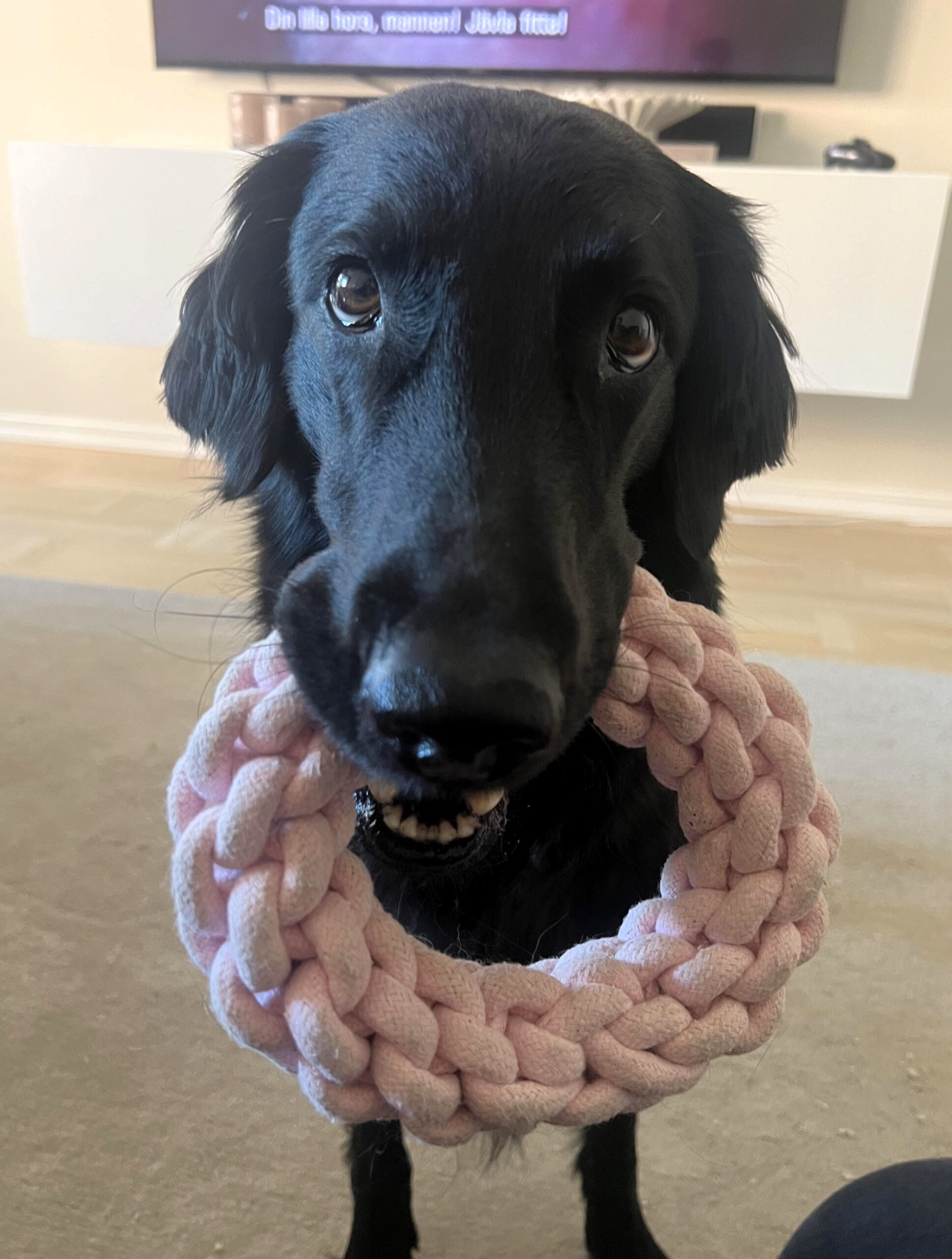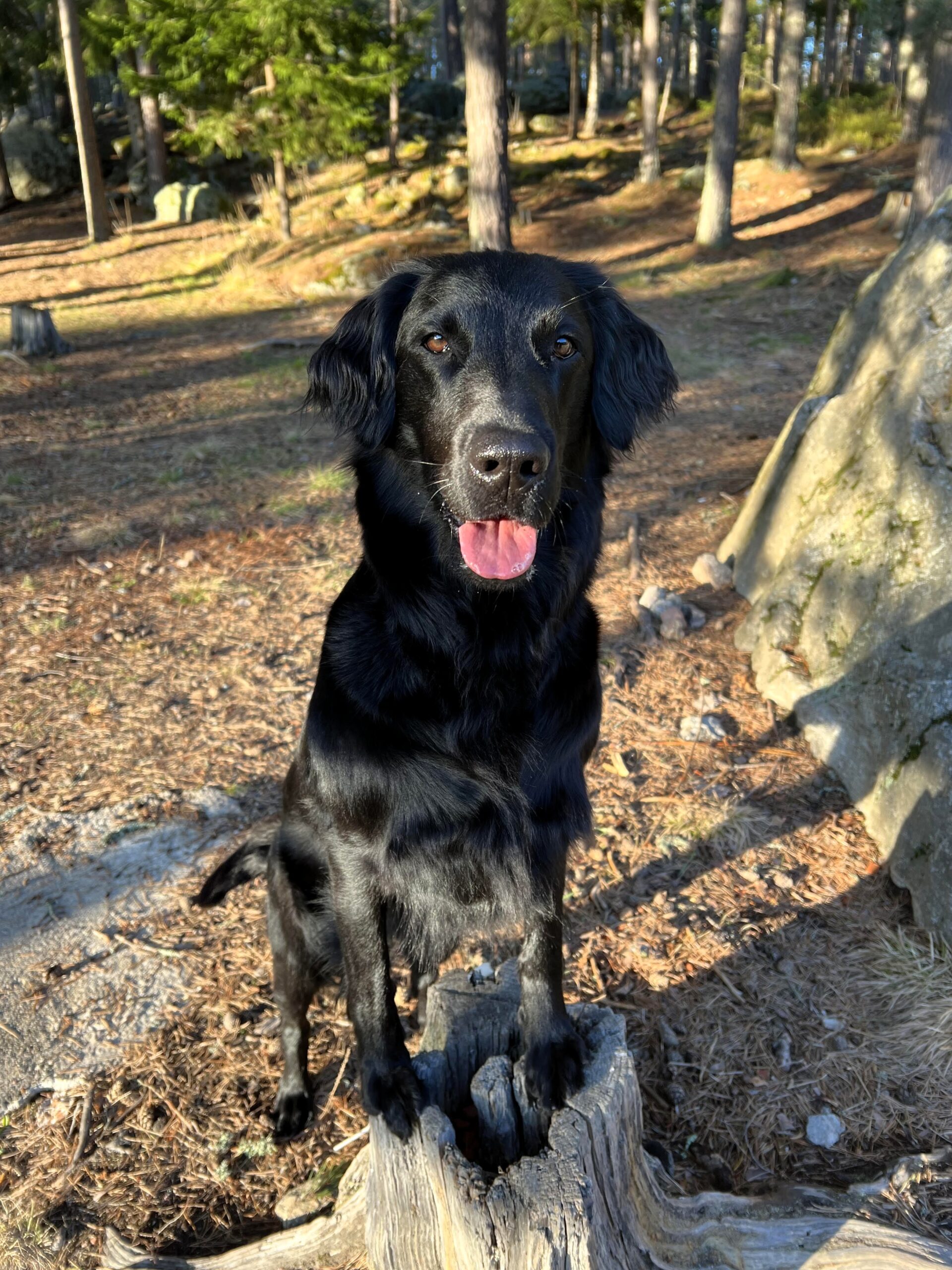 ”Jag har haft Freja sedan hon var två år gammal. Hon är en otroligt snäll men känslig tjej som behöver en förstående, tydlig men mjuk människa. Freja bor med en chihuahua och umgås med familjens hundar utan problem. Hon är ointresserad och osäker på nya hundar och gör utfall för att skapa utrymme om någon hund kommer för nära på promenad. Hon blir stressad av solkatter och jagar dem om hon får möjlighet, och nya platser, främst trappor och trapphus skrämmer henne. Vi har tränat mycket tillsammans och gått flera kurser bland annat vardagslydnad, skvallerkurs, agility, Nose Work, jaktlydnad för retriever och hundmöteskurs. Hon är van att få sin mat som belöning under aktivering och träning, inte i matskål. Freja älskar människor, stora som små. Freja omplaceras på grund av att jag bor mitt i stan vilket inte passar henne. Freja vill bo nära naturen.”