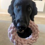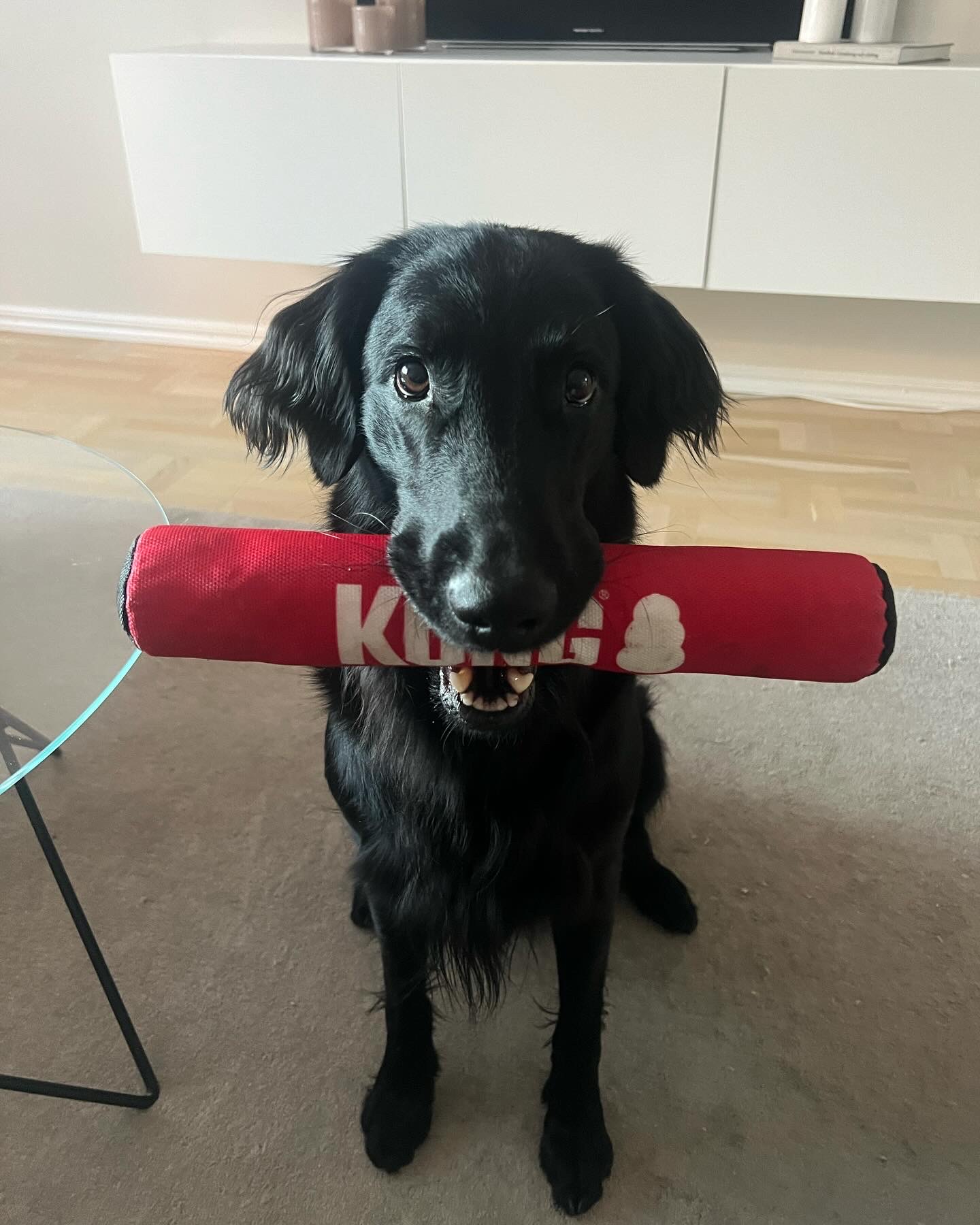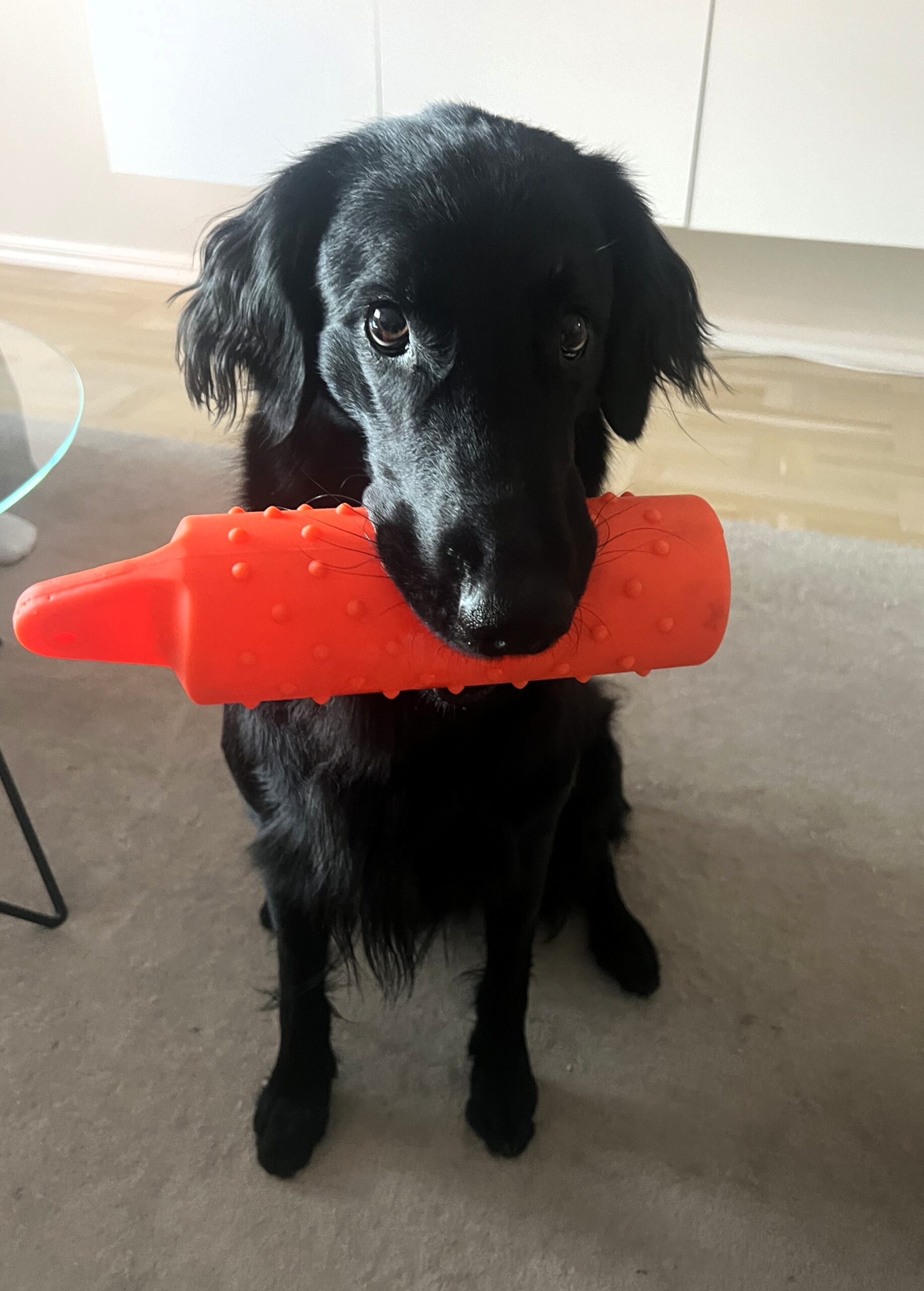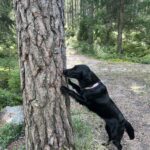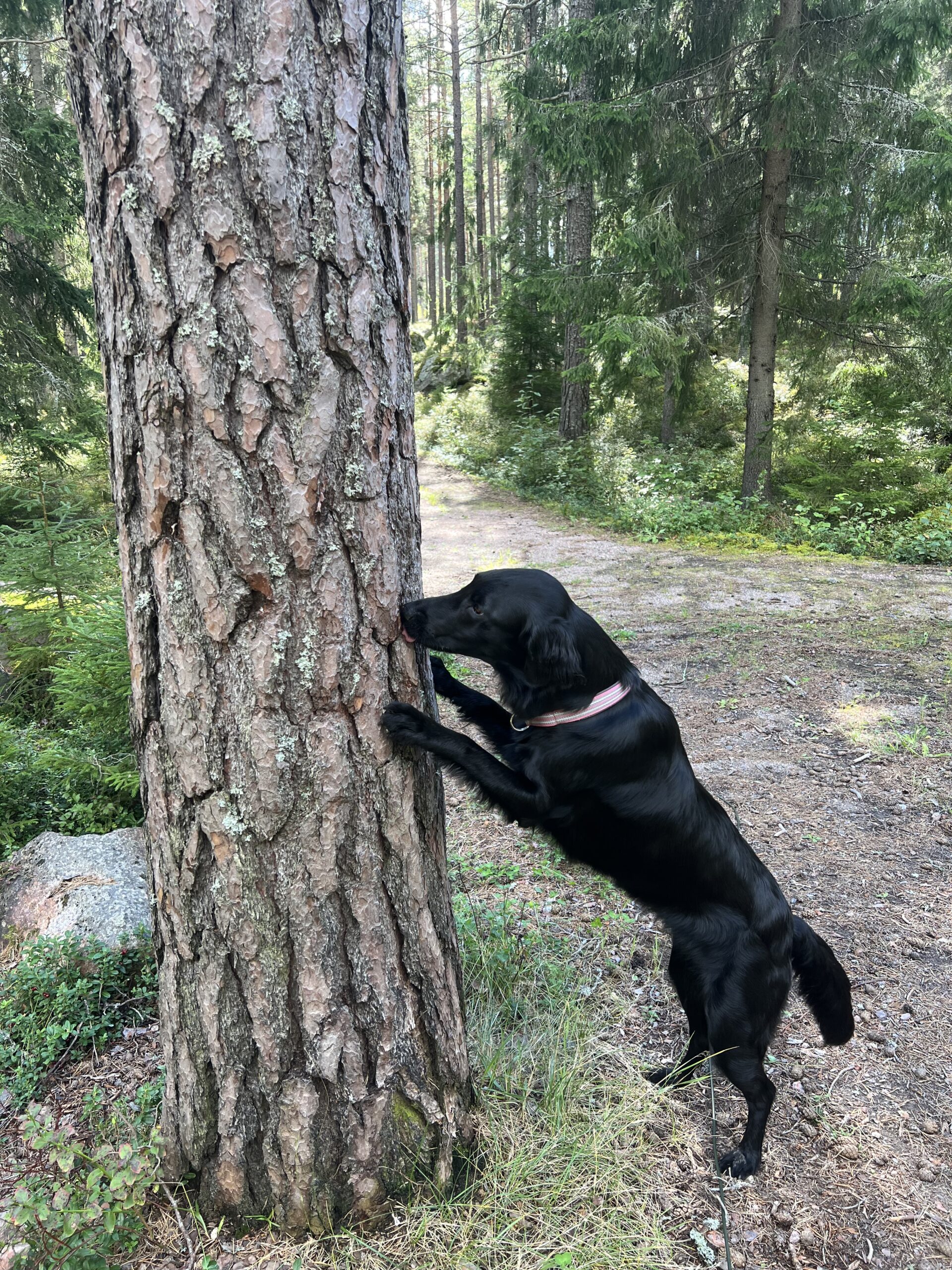 ”Jag har haft Freja sedan hon var två år gammal. Hon är en otroligt snäll men känslig tjej som behöver en förstående, tydlig men mjuk människa. Freja bor med en chihuahua och umgås med familjens hundar utan problem. Hon är ointresserad och osäker på nya hundar och gör utfall för att skapa utrymme om någon hund kommer för nära på promenad. Hon blir stressad av solkatter och jagar dem om hon får möjlighet, och nya platser, främst trappor och trapphus skrämmer henne. Vi har tränat mycket tillsammans och gått flera kurser bland annat vardagslydnad, skvallerkurs, agility, Nose Work, jaktlydnad för retriever och hundmöteskurs. Hon är van att få sin mat som belöning under aktivering och träning, inte i matskål. Freja älskar människor, stora som små. Freja omplaceras på grund av att jag bor mitt i stan vilket inte passar henne. Freja vill bo nära naturen.”