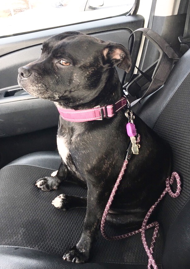 ”Kira är en typisk staffe på det sättet att hon älskar uppmärksamhet och ständigt vill vara nära. Alla som kommer hem till oss möts av ett lek-morr-yl samtidigt som svansen viftar så man tror den ska ramla av. För att vara staffe är hon dock väldigt lugn och otroligt tålmodig, hon är min första hund och jag har kört med positiv förstärkning som träningsmetod. Då det är en förarvek ras får man inte vara för arg eller hårdhänt, vilket heller inte behövs.