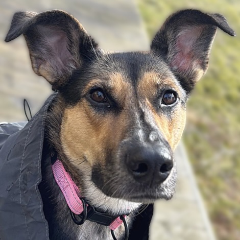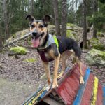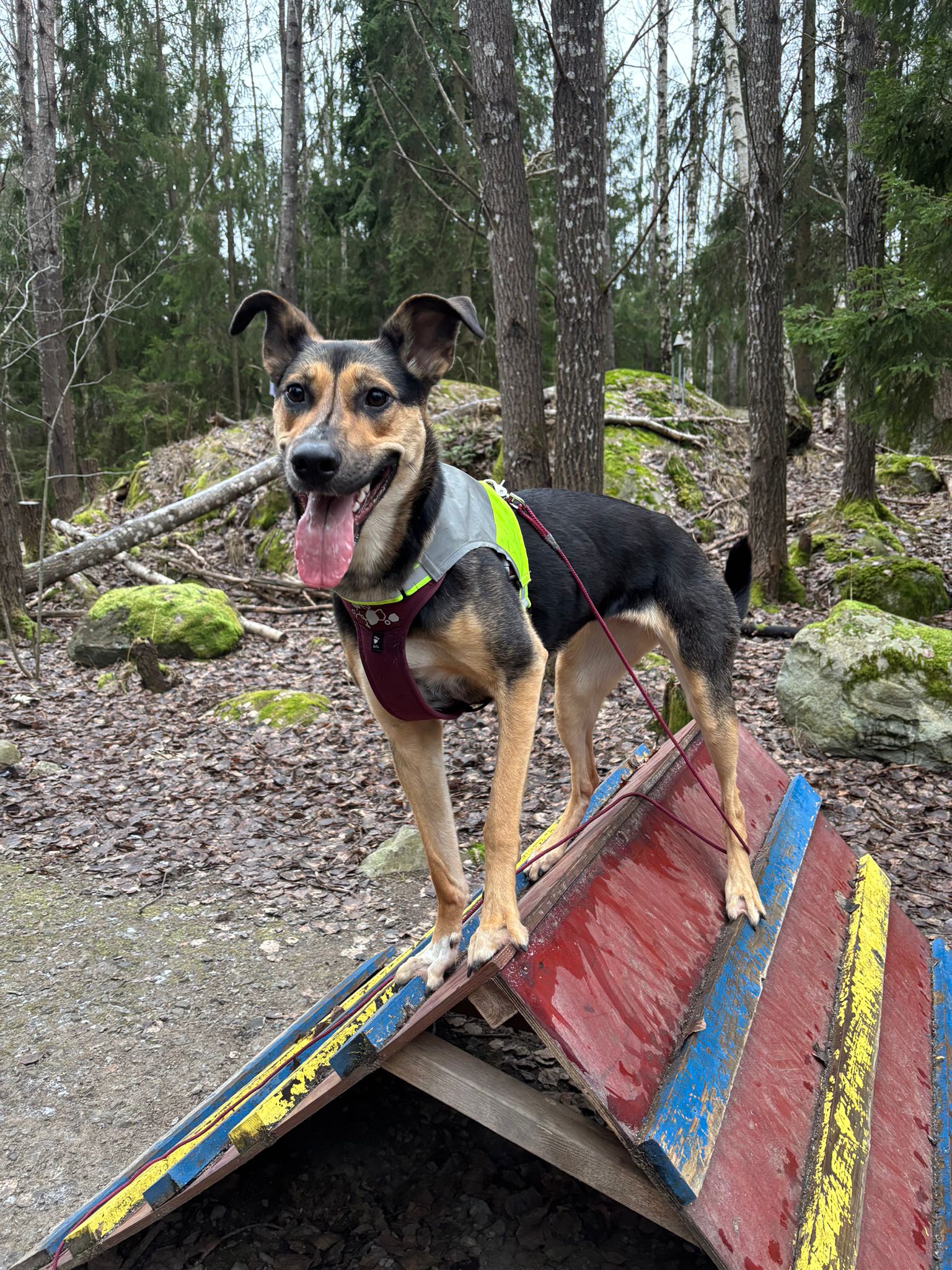 ”Leilah är en underbar och kärleksfull hund med otroligt stor potential. Hon njuter att vistas i skog och mark och springa, hoppa, nosa och utforska. Just nu bor Leilah på en gård med möjlighet att röra sig mycket fritt vilket hon stormtrivs med. Hon går fint i koppel när det behövs. Leilah är väldigt försiktig i nya sammanhang och människor men när hon känner sig bekväm är hon trygg, lekfull och väldigt gosig. Leilahs självförtroende växer i takt med att hon vänjer sig vid både miljöer och de runt omkring henne. Hon tycker om att leka med hundar i samma storlek, men kan vara lite hårdhänt i leken med mindre hundar. Hon har en del jaktinstikter så hon bör inte bo i ett hem med andra djur, då även katter är något som hon gärna jagar om hon får chansen. Vi har märkt att hon har lite känslig mage och just nu äter hon ett sensitive torrfoder som fungerar bra, hon är bra i magen och pälsen är fyllig och glansig. Leilah sköter sig exemplariskt när hon är ensam kortare stunder. Hon är också en riktig mystjej som gärna sover nära sin människa. Hon tycker om agilityträning och att hoppa så vi tror att ett aktivt hem skulle passa henne väldigt bra.”