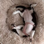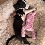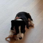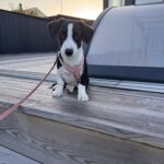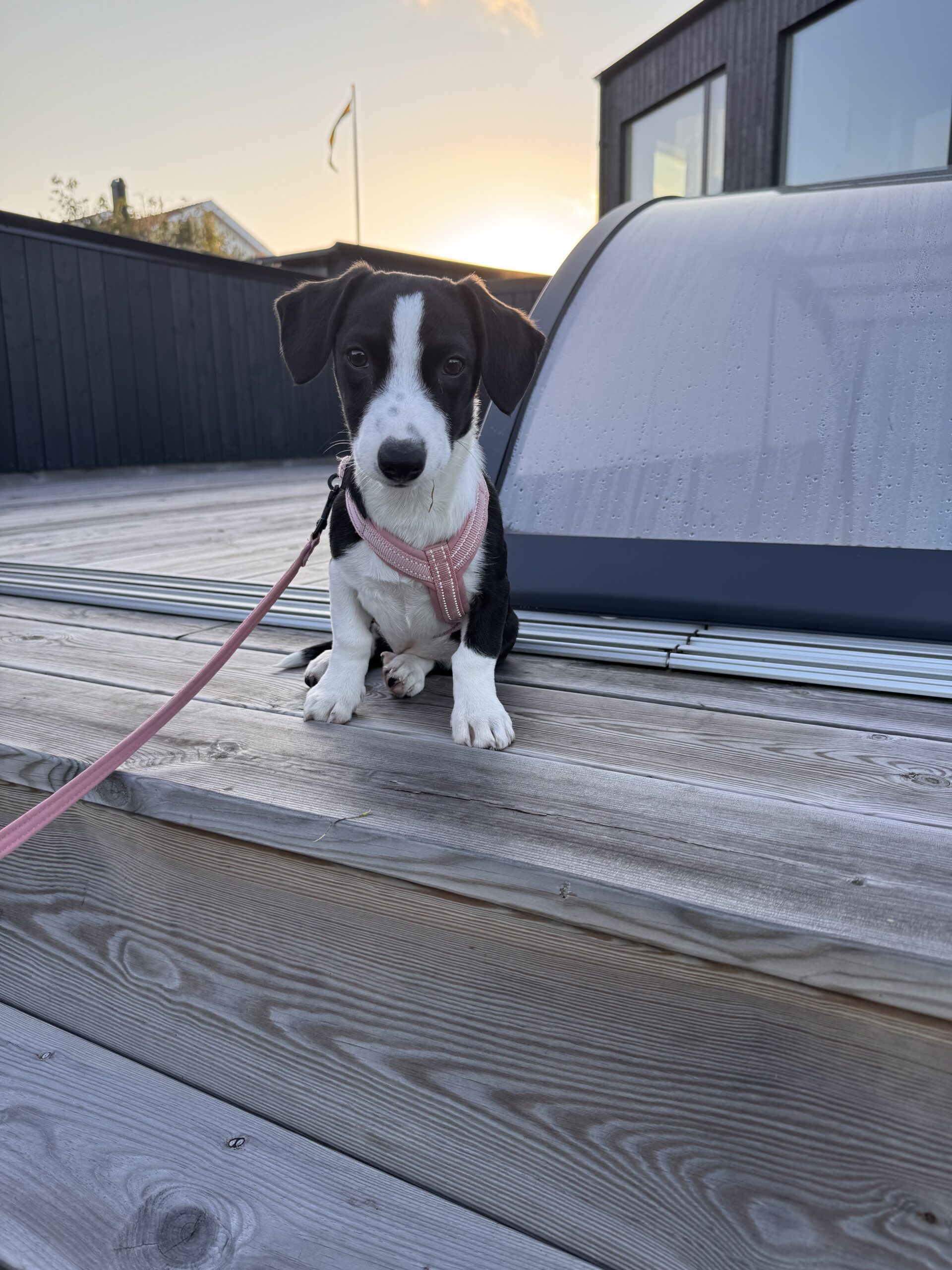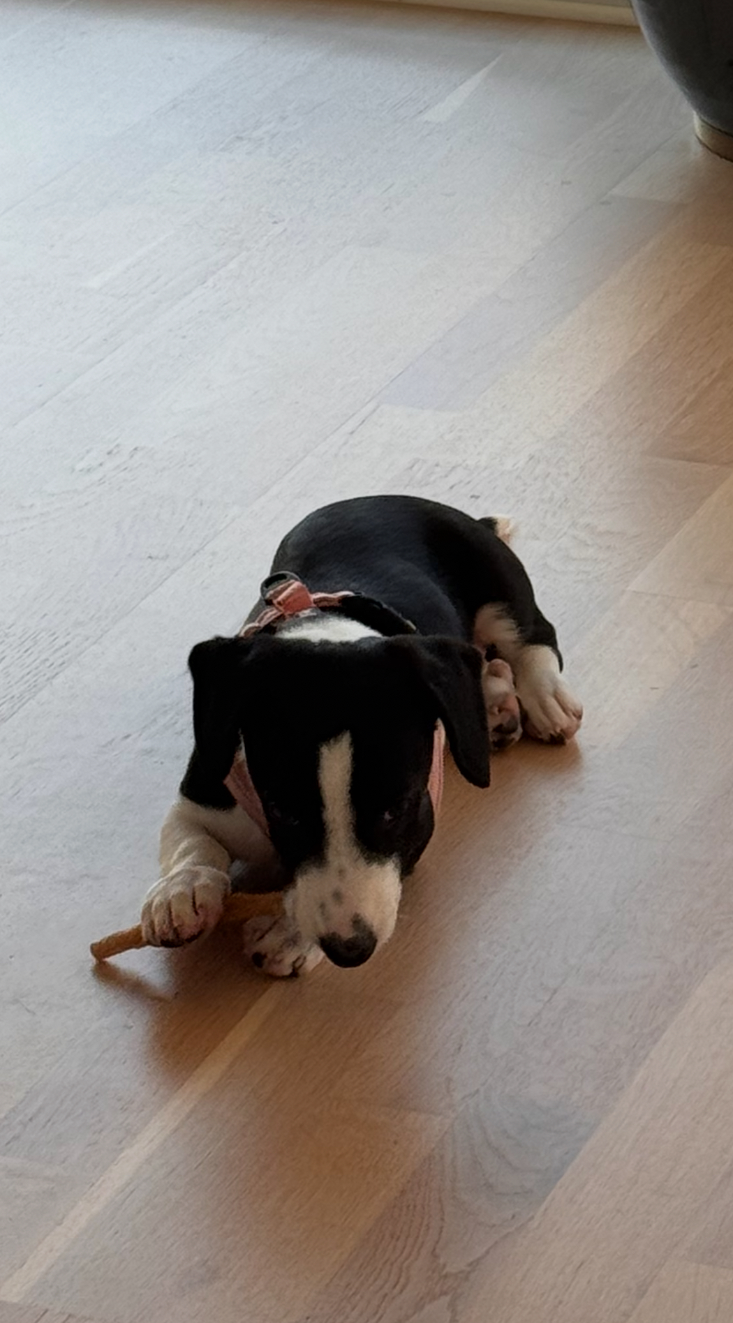 ”Sofia är en söt, snäll och pigg valp som är lätt att älska. Leker, springer och sover om vartannat. Har inte haft några olyckor inomhus, men det behöver man såklart fortsätta öva på. Har lärt sig sitt och lyssnar på ordet stopp, påbörjat koppelträning.”