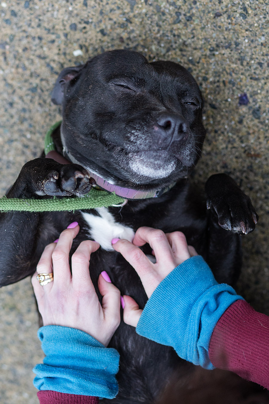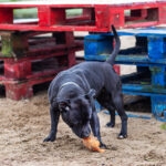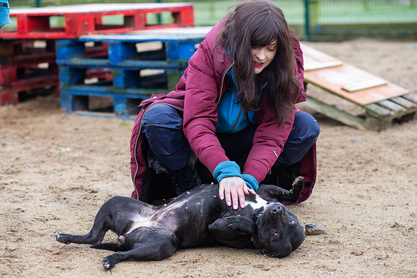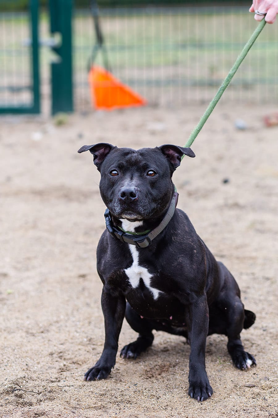 Winne är en social tjej, självsäker och vänlig. Vi träffade henne när vi besökte poundet i februari och hon hälsade glatt på oss alla, snabb med att lägga magen i vädret och förvänta sig klapp och kel. Hon åker bil bra med jourhemmet och har skött sig bra ute på promenaderna, verkar inte bry sig om cyklar eller annan trafik och hälsar gärna på allt och alla om hon ges möjlighet. När hon kastrerades hos veterinären fick hon också lovvord för sitt temperament.